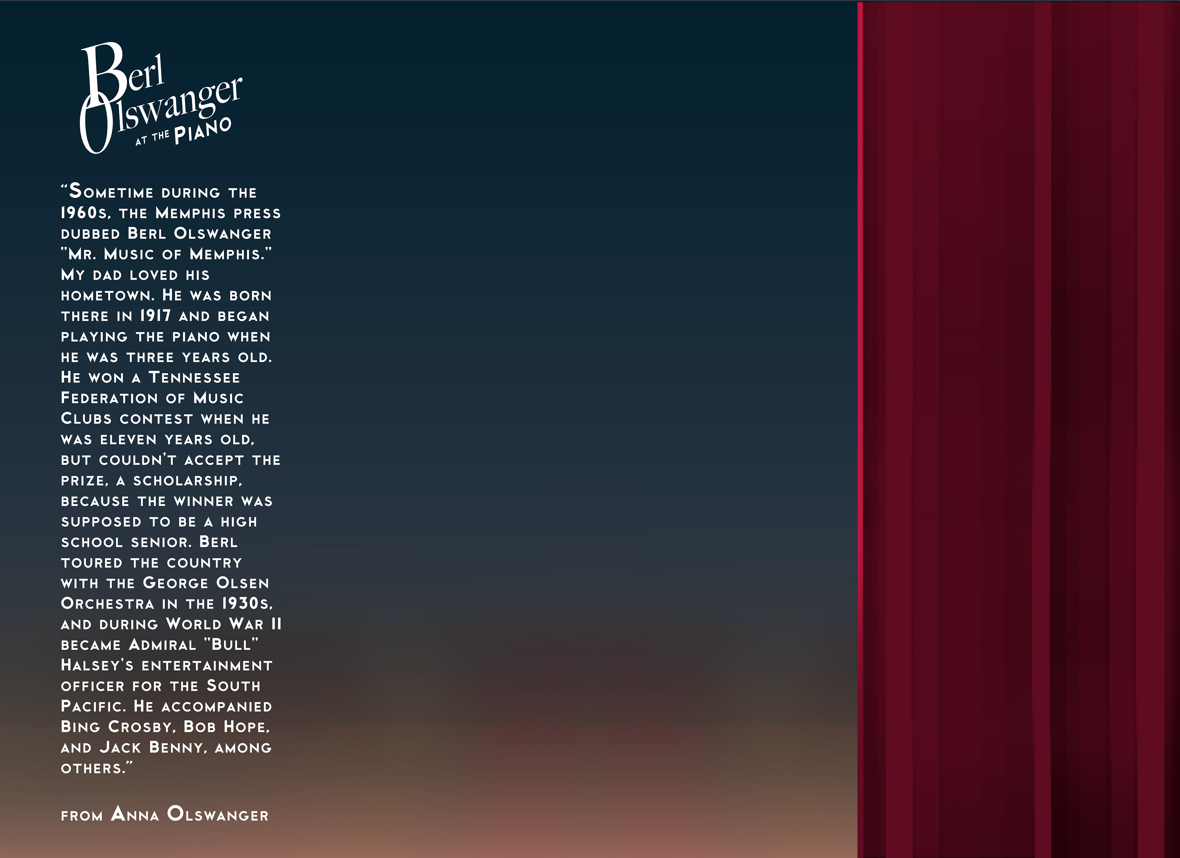 Berl Olswanger was born above his father’s dry goods store in Memphis. Berl a young pianist got his big break at the age of twelve making his professional debut at Dreamland Gardens, a Memphis dance hall. Berl grew up to become a composer and arranger. He toured the country with big band orchestras and accompanied Bing Crosby, Bob Hope, and Jack Benny, among others. While he could have been a big star, he chose to return to Memphis to be with his loved ones.